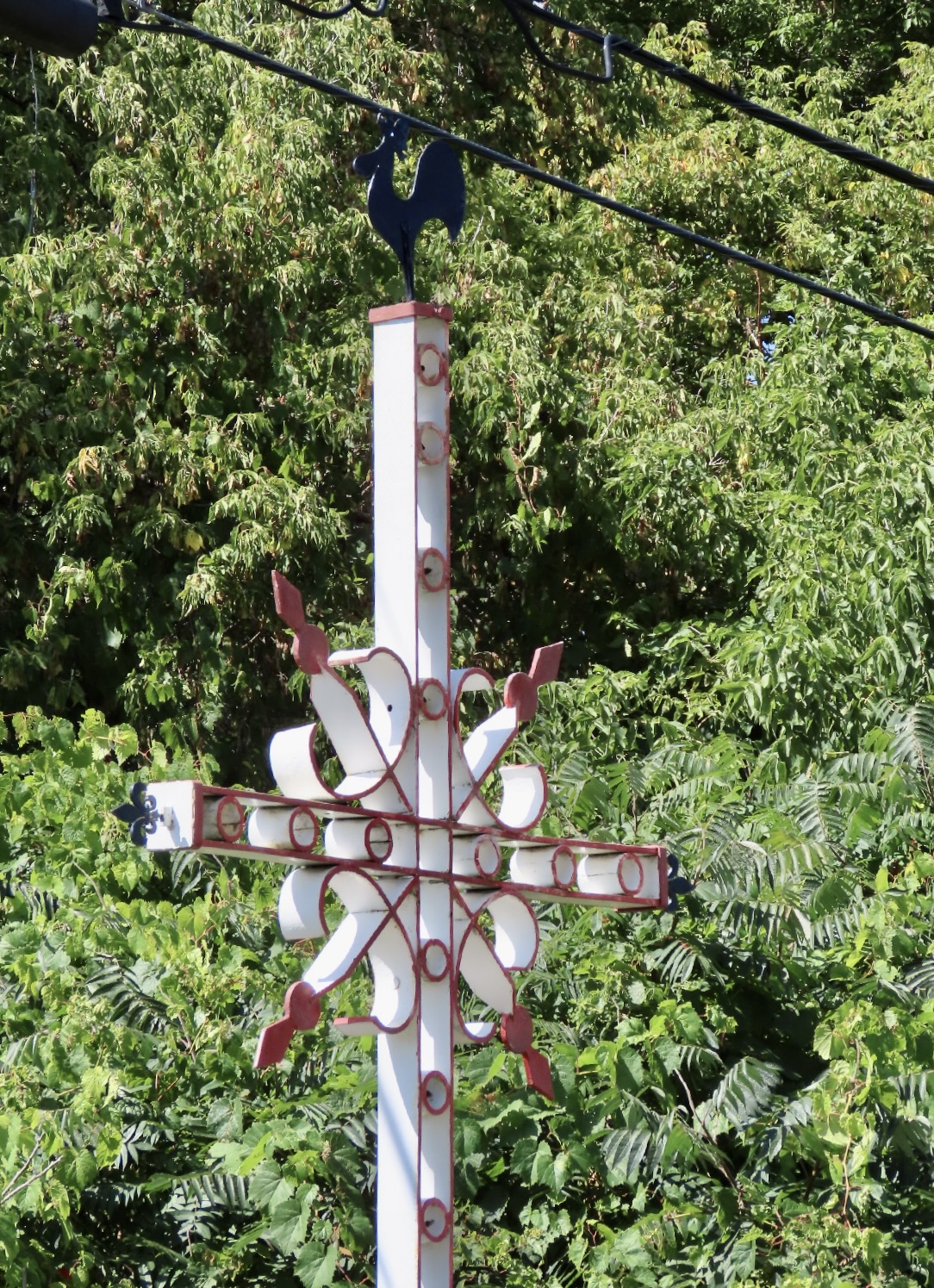 Croix de métal de type ouvragé peinte en blanc et bourgogne, axe ornementé, décor du pal à motif géométrique.