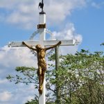 Croix de bois peinte en blanc et corpus en fibre de verre.
