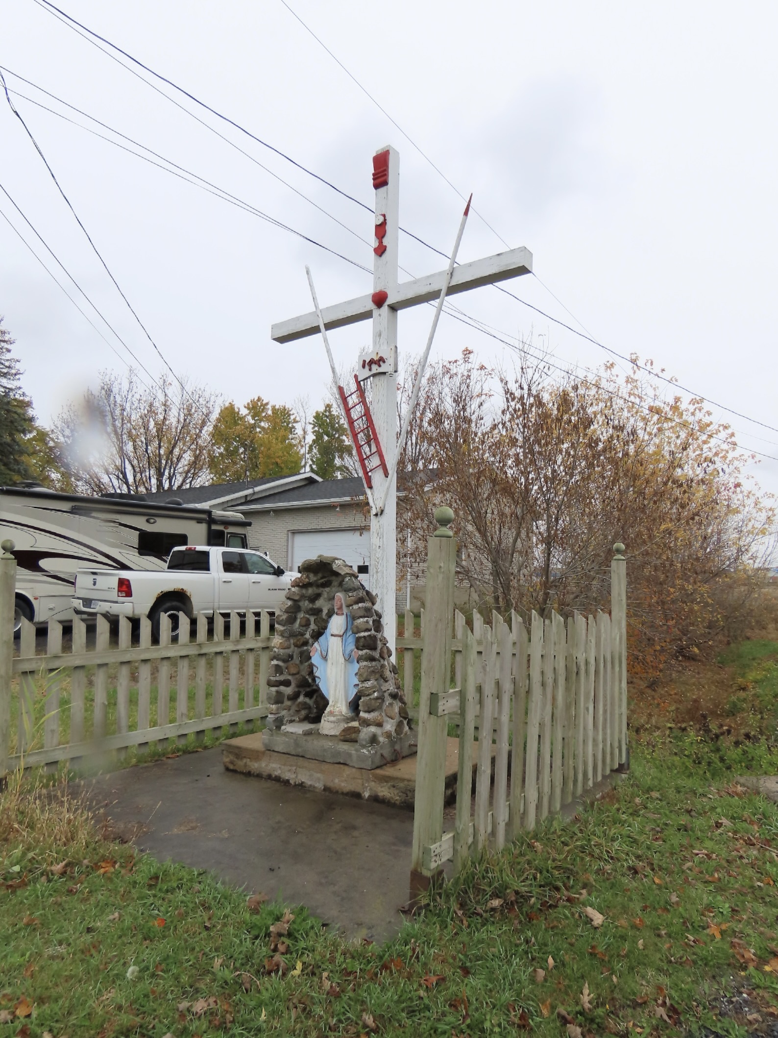 La croix repose sur un socle de ciment. Une grotte contenant une statue de la Vierge est placée au pied de la croix.