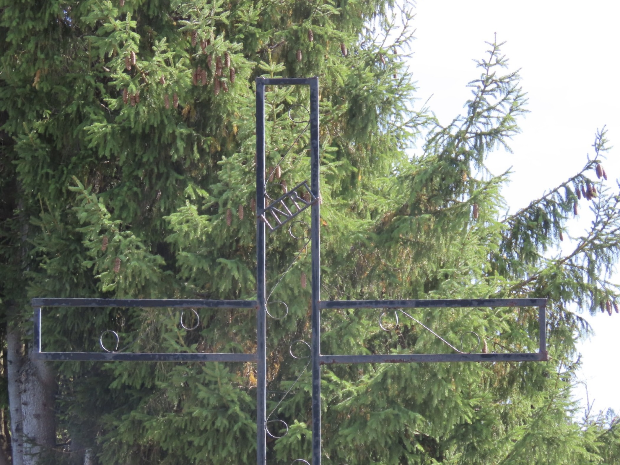 Cette croix de métal est peinte en noir.